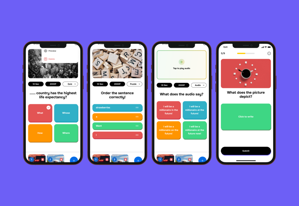 Question types: Multiple choice, true/false, fill in the blank, etc.